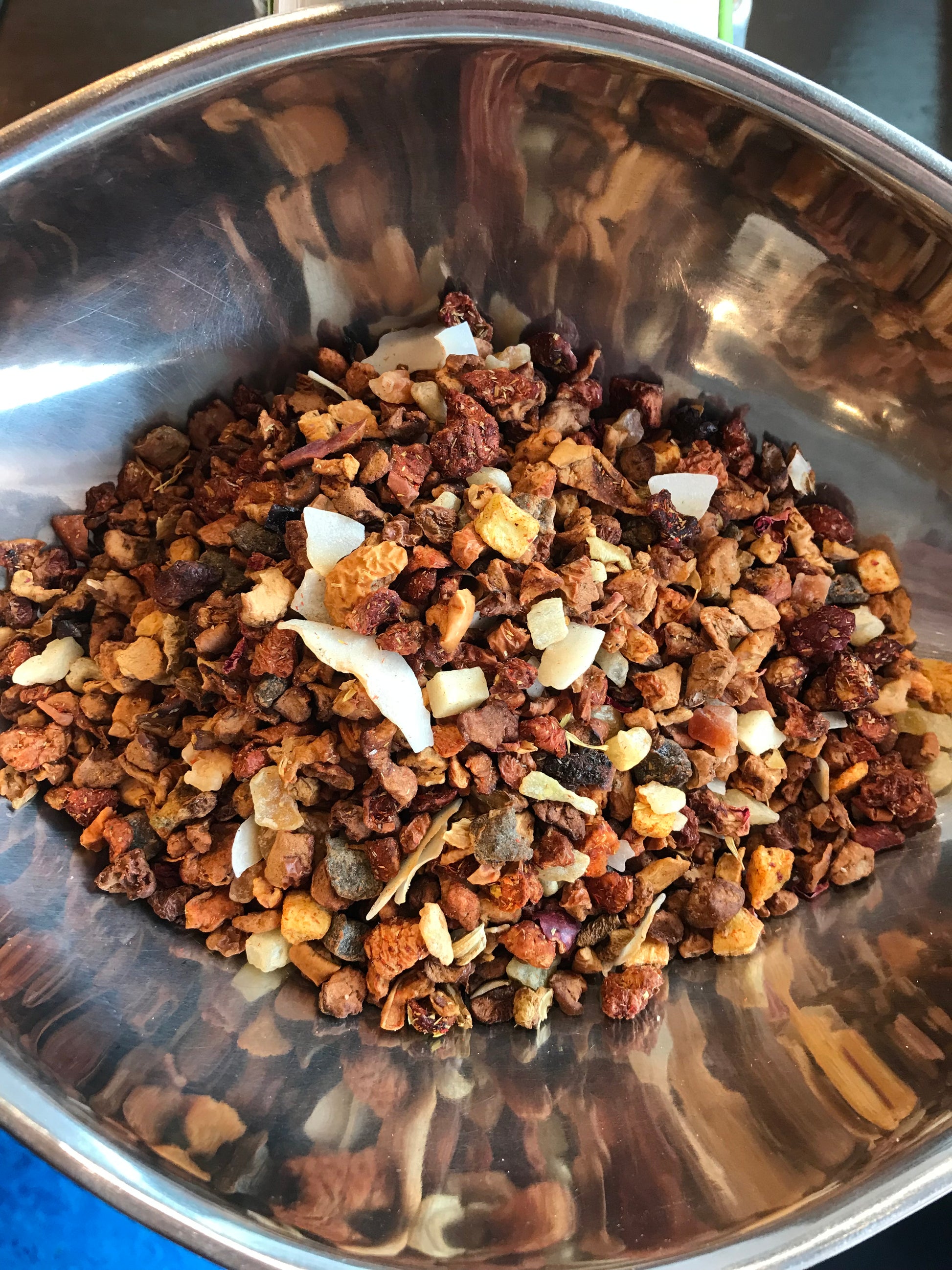 Ingredients: acidified apple pieces (citric acid), pineapple cubes, papaya cubes, peach pieces (rice flour), flavoring, rose petals, safflower, marigold blossom, sugar.