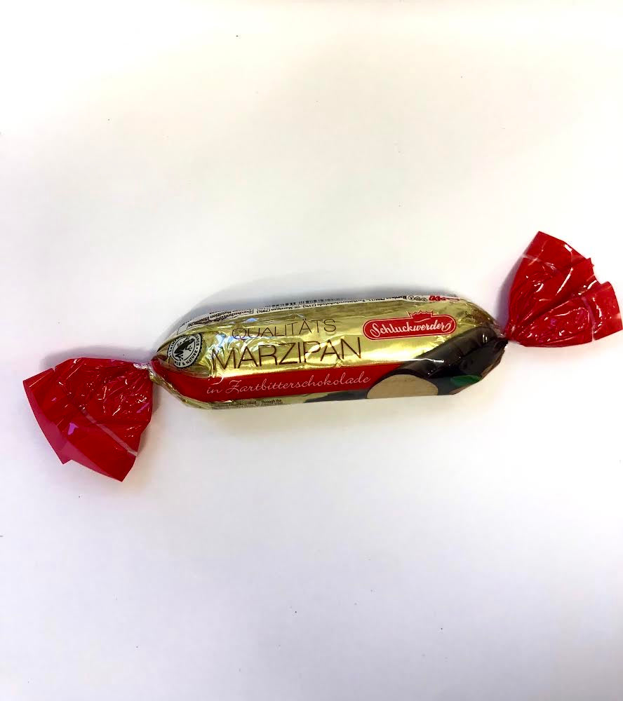 Plain chocolate (21%) covered marzipan (79%). Weight: 50g.