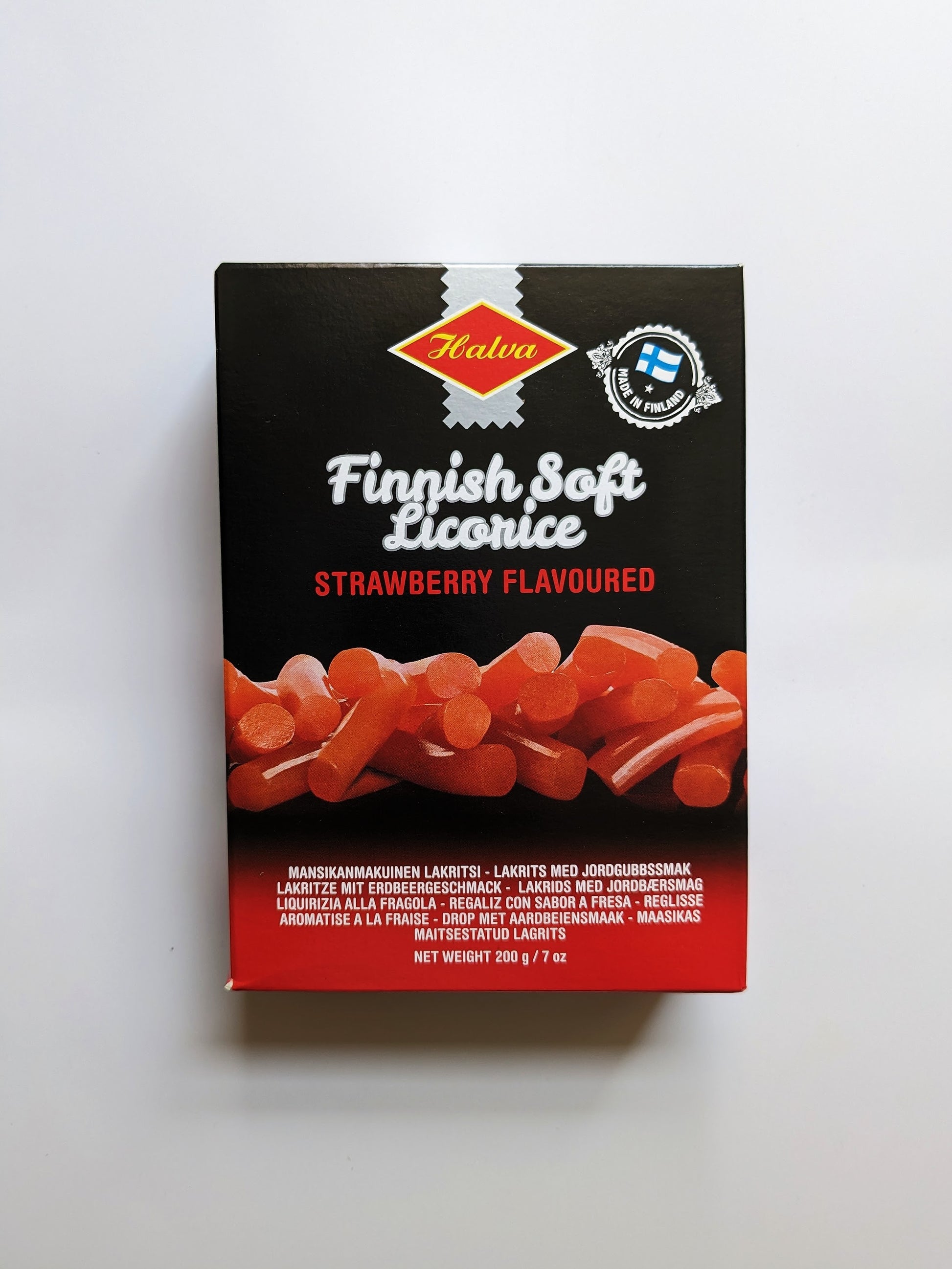 This Finnish licorice is soft and smooth in texture with a rich strawberry flavor. Comes in a 200g box.