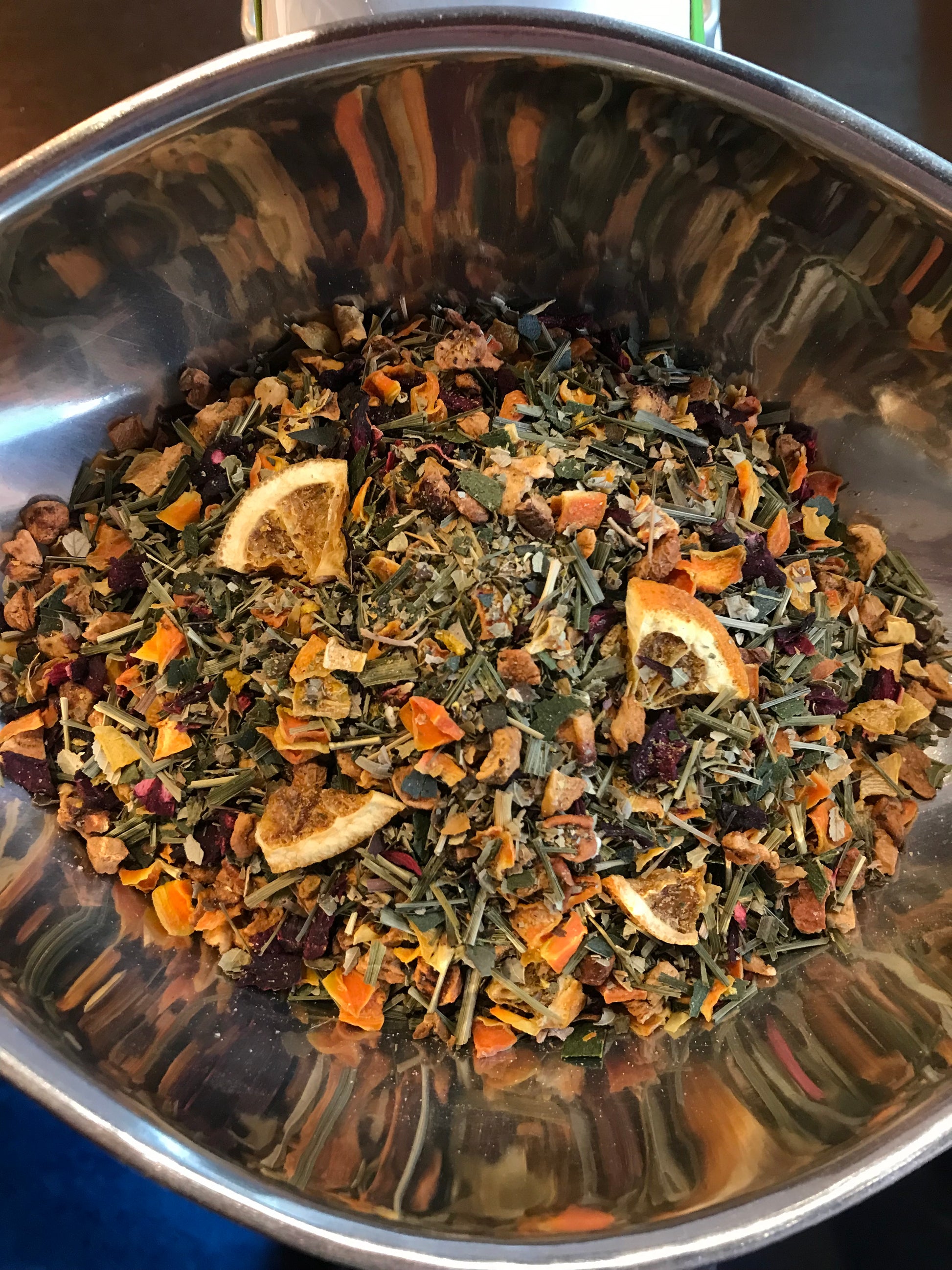 Characteristics: Fragrant tangerines and oranges are complemented by the freshness of eucalyptus and lemongrass, earthy beetroot pieces, and sweet apples in this colourful and aromatic tisane. Sweet and citrusy.